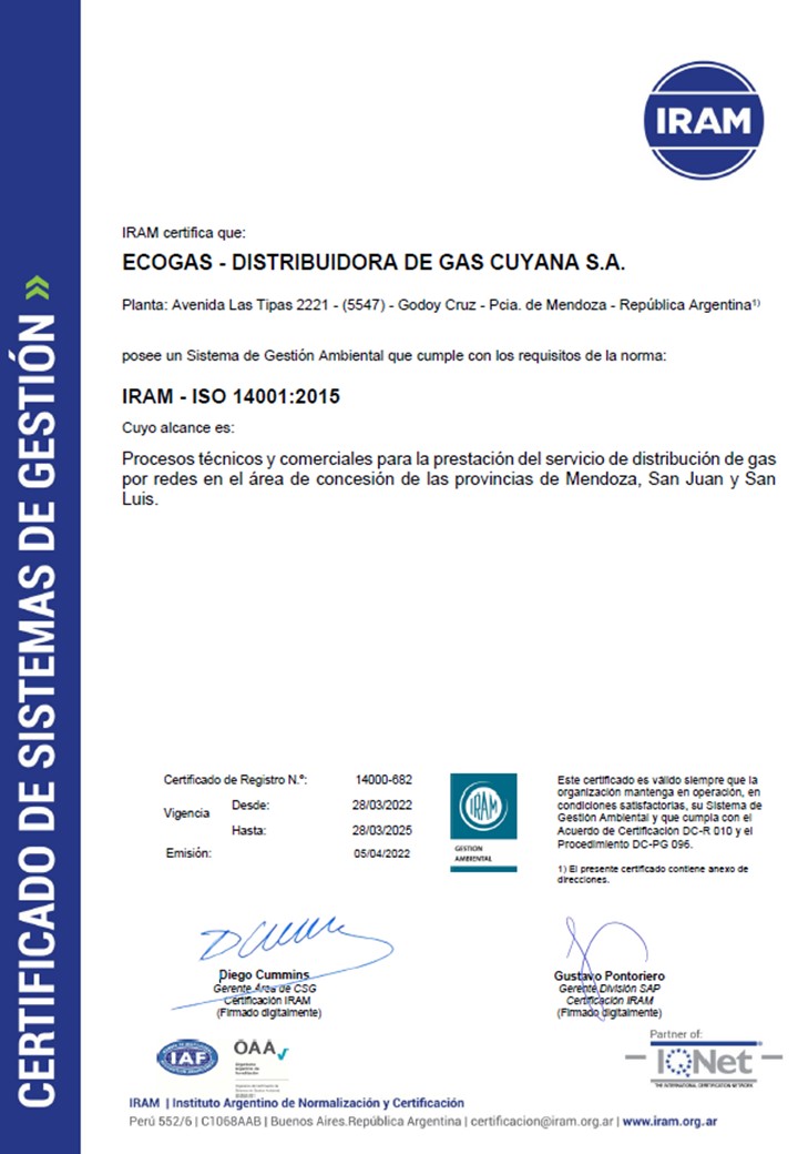El Sistema de Gestión Integrado de Salud, Seguridad y Ambiente posee el siguiente alcance: "Actividades técnicas y comerciales para la prestación del servicio de distribución de gas por redes en el área de concesión, provincias de Catamarca, Córdoba, La Rioja, Mendoza, San Juan y San Luis."
