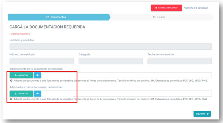 En la sección Documentos, deberá ingresar los archivos de frente y Dorso del DNI.