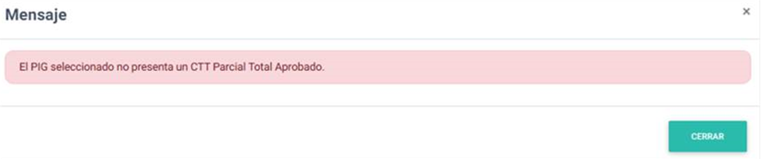 Se verificará que exista un CTT PARCIAL TOTAL aprobado. En caso de no contar con el mismo, visualizará el mensaje que se muestra a continuación: