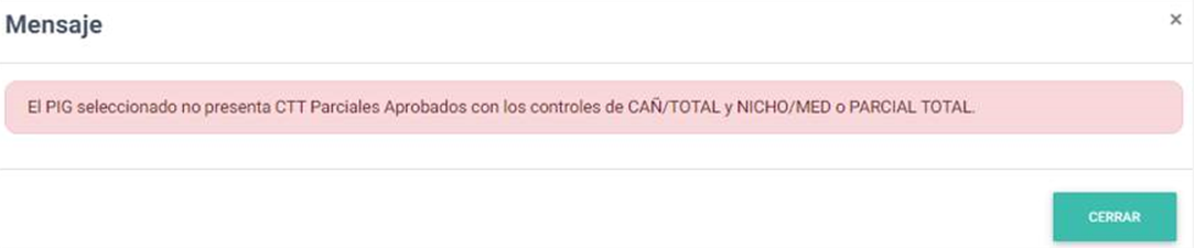 El sistema controlará que existan parciales aprobados de CAÑ/TOTAL y de NICHO/MED o un CTT PARCIAL TOTAL aprobado. En caso de no contar con los mismos, visualizará el mensaje que se muestra a continuación: