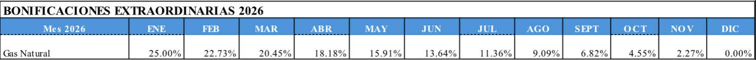 Durante el año 2026 se aplicará, para los usuarios de gas natural que resulten beneficiarios del SEF una bonificación adicional extraordinaria sobre el consumo base, decreciente a lo largo del año.